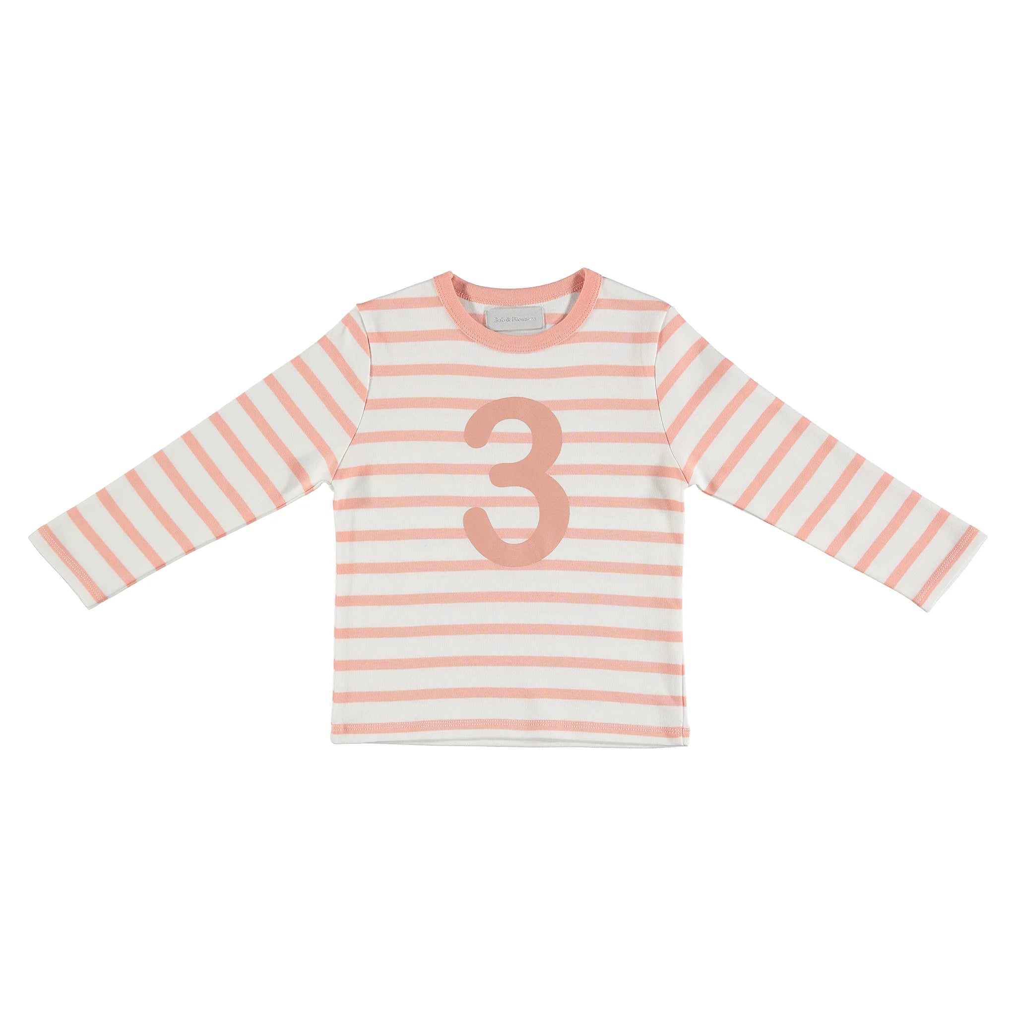 Shrimp & white breton striped cotton T shirt, featuring a dusty pink number 3 screen print. Long Sleeves only.