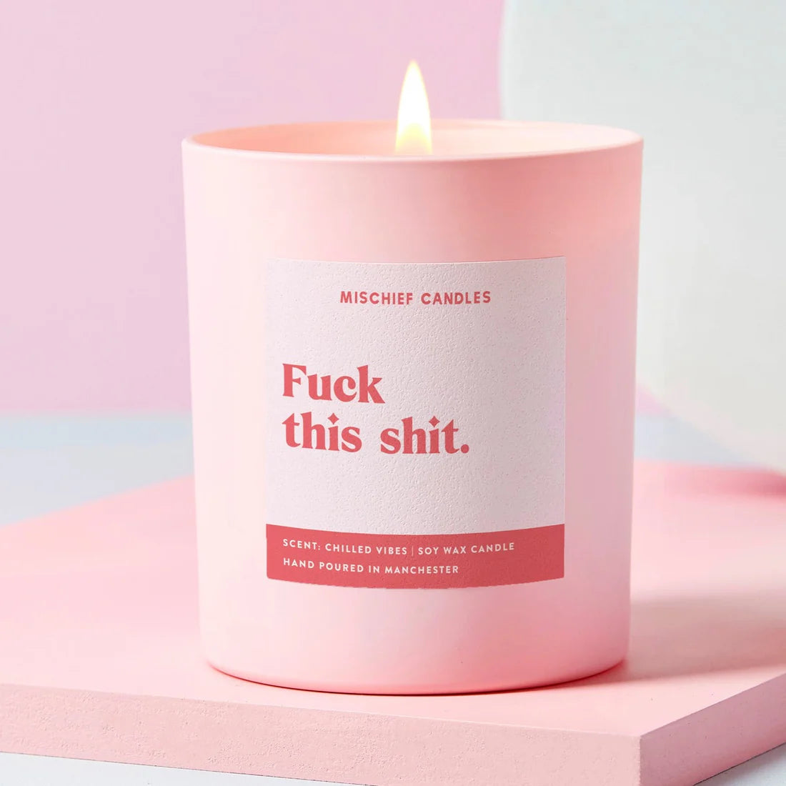 A funny candle gift for her that says exactly what she's thinking! The message on the candle reads, 'Fuck this shit' in our signature bold red font on a pale pink label.