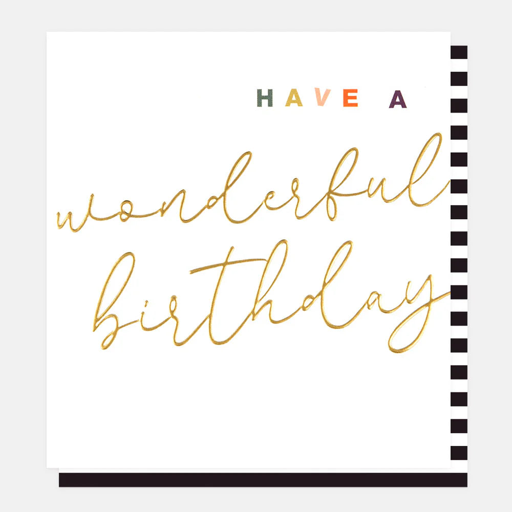 Part of our new From Me To You range this beautiful gold calligraphy 'have a wonderful birthday' card features gold foil and embossing for that extra special touch.