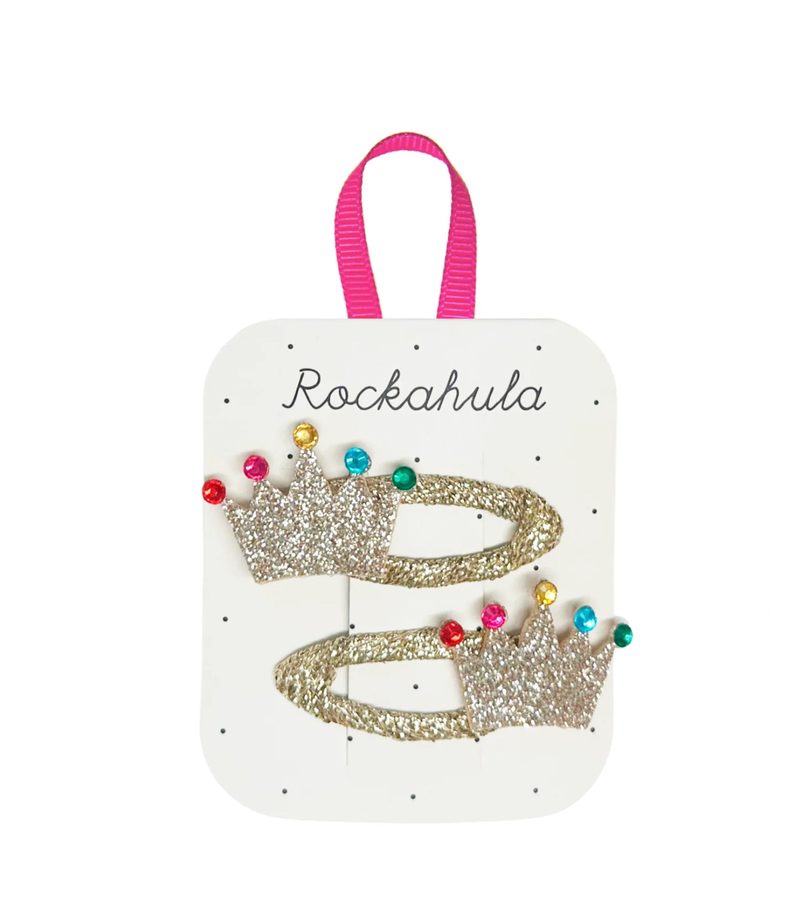 Celebrate in royal style in these glittery Crown Clips! Topped with five colourful gems, these clips are set onto gold wrapped snap clips.