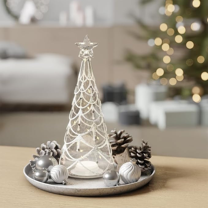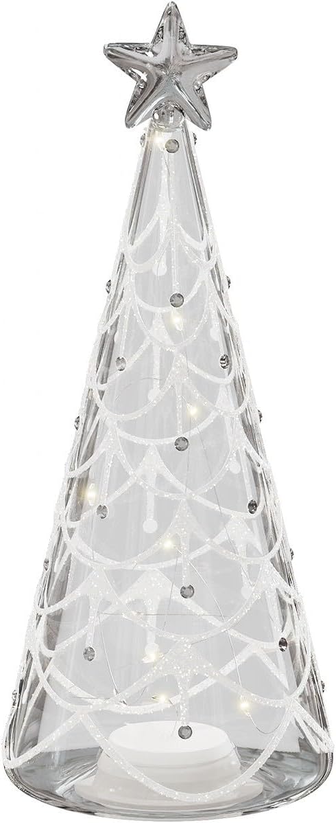 - Tall Glass Tree Ornament – 22 cm clear glass Christmas tree with intricate detailing and inner LED lights