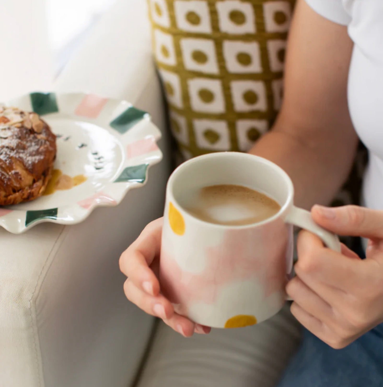 A little larger for a bigger brew. Our new large mugs are made from glazed stoneware and hand painted in bold prints and bright colours to bring a smile, along with your morning caffeine boost. Painted in a pale pink with white and yellow flowers, this mug will add an air of calm to accompany your cuppa.