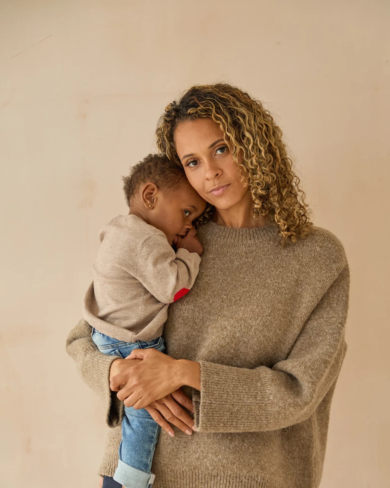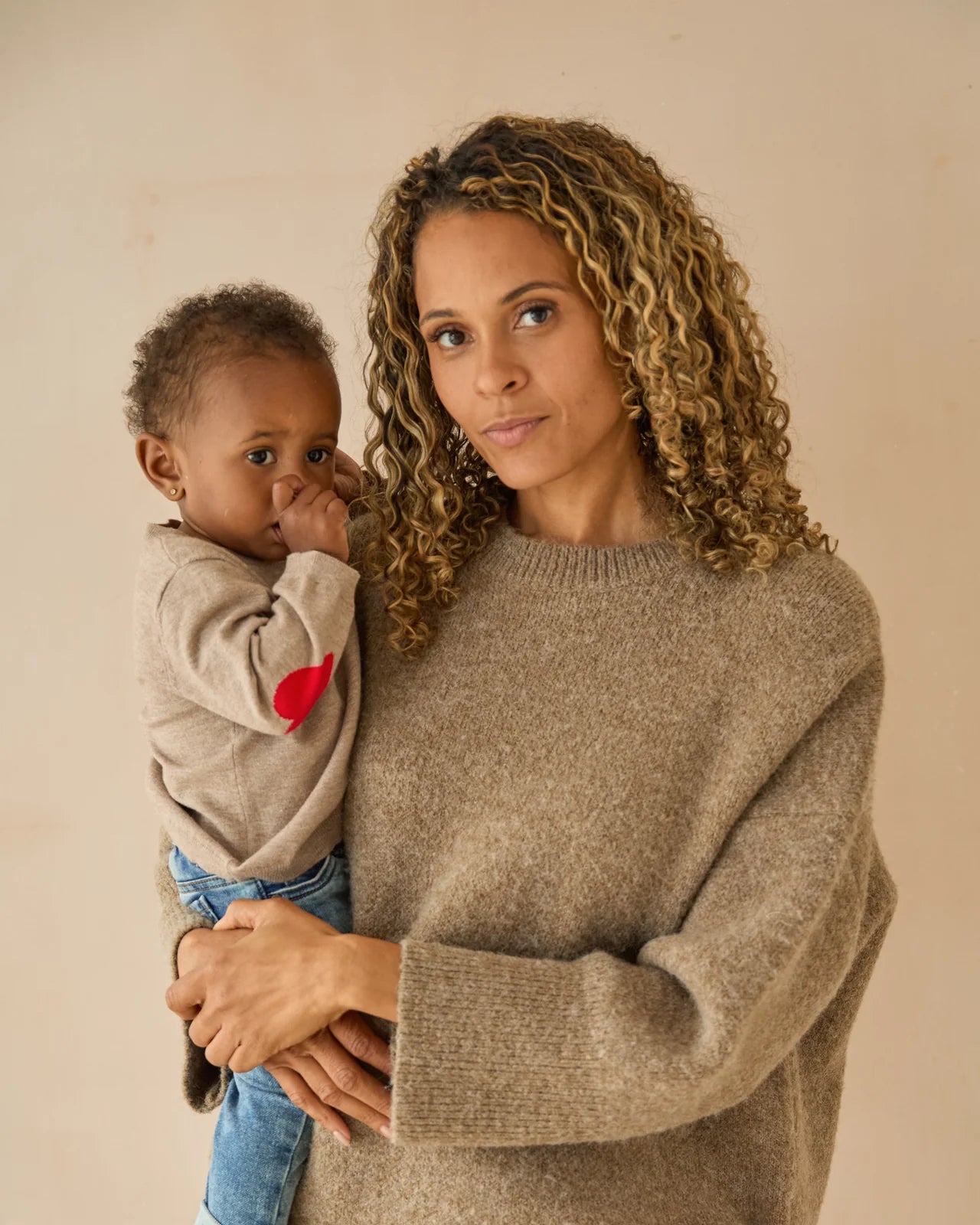 Kitten set is a two piece set. A neat crew neck jumper with a unique pop of colour red heart detailing to elbow. The trousers feature a soft elasticated waistband, with a faux tie detail and slight wide leg.