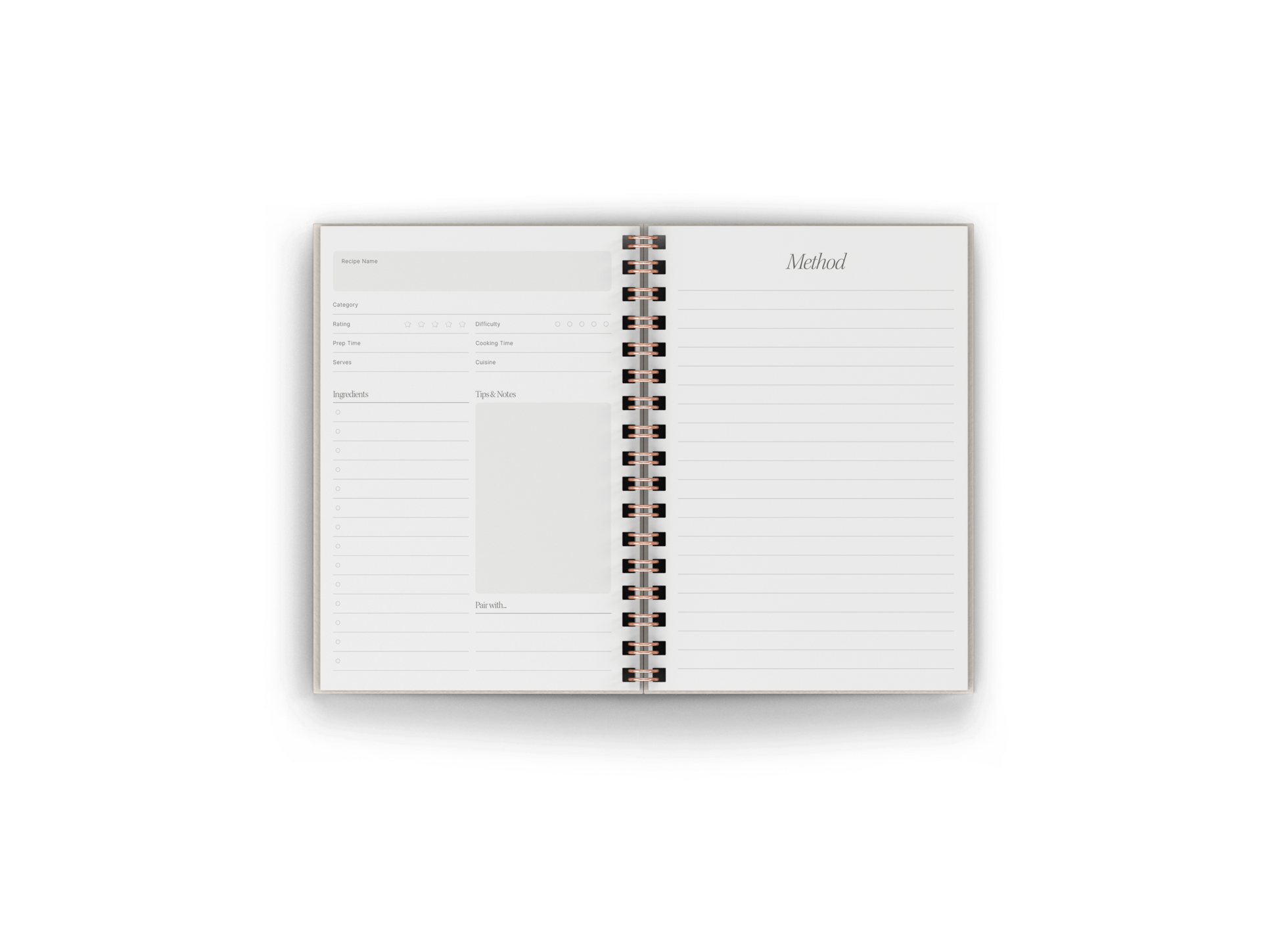 • Comprehensive Recipe Logs: Record each of your favourite recipes with dedicated sections for title, ingredients, instructions, preparation time, cooking time, servings, and personal ratings.
