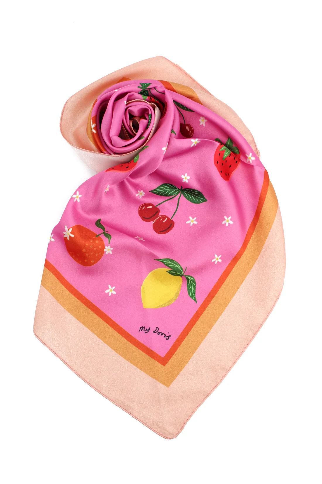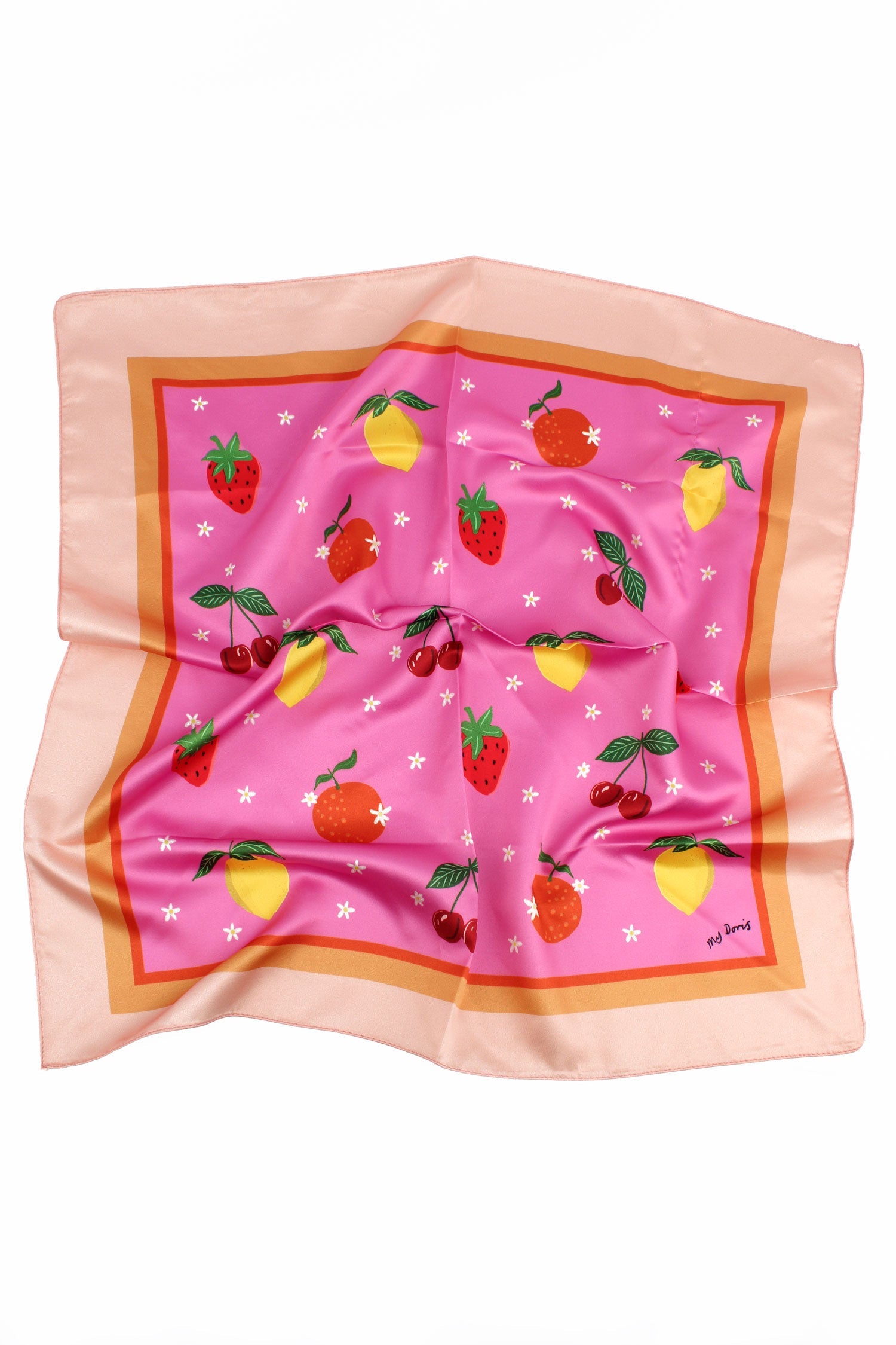 Stylish scarf made in Turkey from polyester satin and printed with bright bees and dragonfly illustrations. A versatile piece that can be worn around the neck, draped over shoulders, or used as a fun bag accessory.