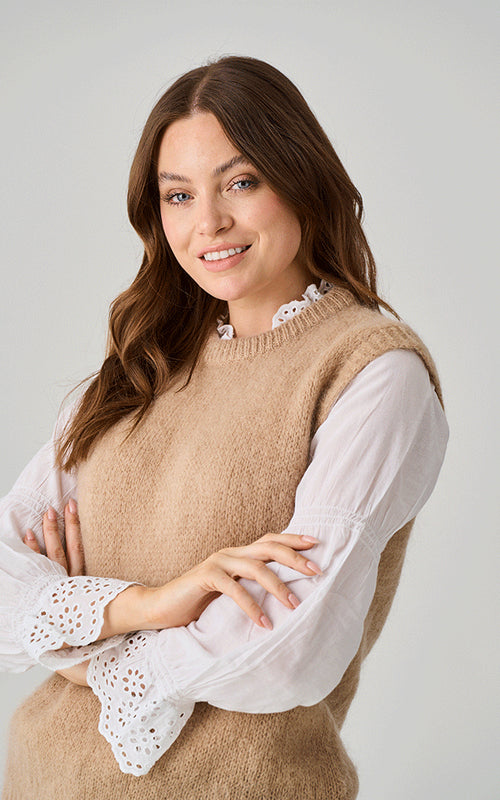 Light, fluffy, and full of charm — Carmel is the kind of knit you’ll throw on without thinking twice. With a soft mohair blend and a simple round neck, it’s an easy layer that works across the seasons. Available in Toffee, Duck Egg, and Chocolate.One Size fits 10 to 14. Chest 47cm Length 61cm. Made from 15% Mohair, 15% Wool, 34% Polyamide, 32% Polyacrylic, 4% Elastic.