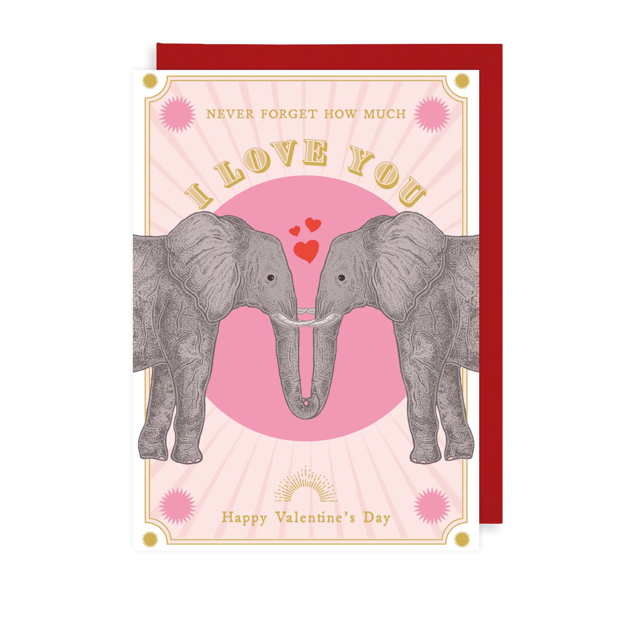 Say Happy Valentine's Day with this adorable card. This card features two elephants and reads 'Never forget how much I love you. Happy Valentine's Day'.