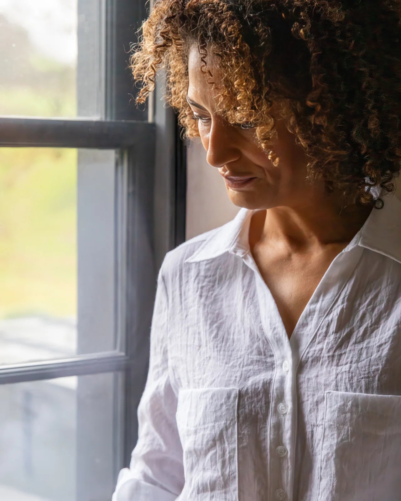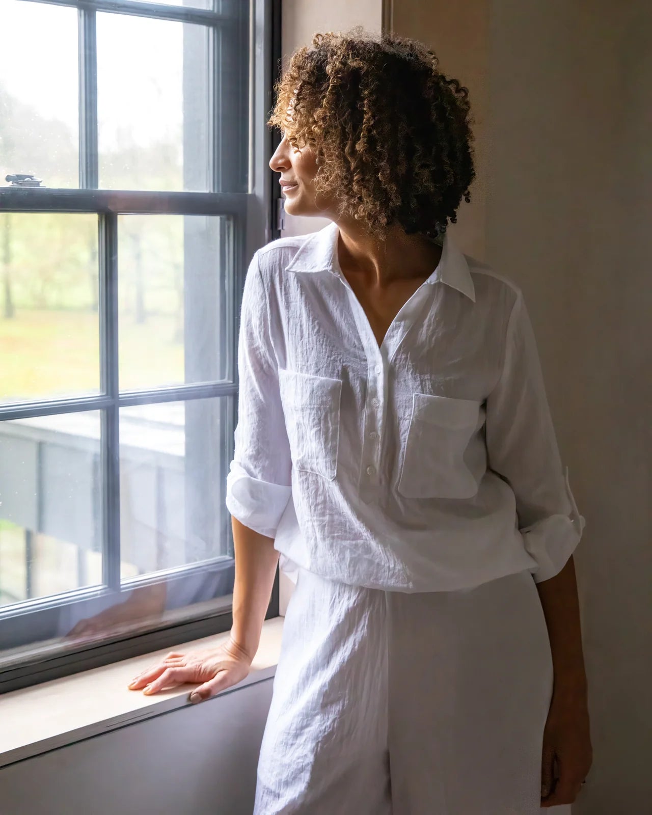 The Zoe Shirt is a neat-fitting style crafted from a floaty white shirting fabric for an elegant drape. It features a classic collar with a subtle V-neck and three light tortoiseshell buttons at the front. Finished with two breast patch pockets and button tabs on the sleeves, it offers a refined yet relaxed look.